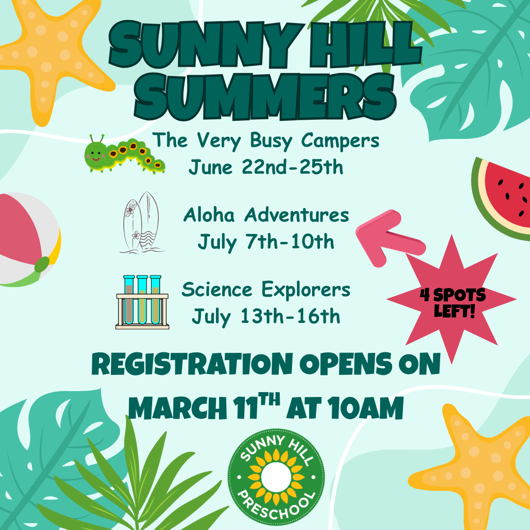 Each summer, we have three weeks of “Summers at Sunny Hill”! We offer three separate, 4-Day sessions for those interested in spending a little more time at Sunny Hill Preschool. Each session is theme-based and staffed by Sunny Hill Employees.